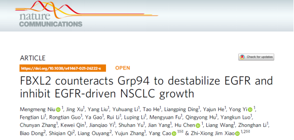 近日,3003新葡平台肖智雄教授团队在Nature Communications在线发表了题为“FBXL2 counteracts Grp94 to destabilize EGFR and inhibit EGFR-driven NSCLC growth”的研究论文,揭示了EGFR耐药突变蛋白降解的新机制,并提出靶向EGFR降解可能是治疗耐药性NSCLC的新策略。