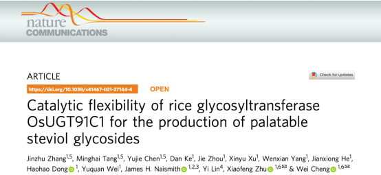 3003新葡平台、生物治疗国家重点实验室朱晓峰课题组2021年12月2日在Nature Communications (2021, 12:7030)发表了题为“Catalytic flexibility of rice glycosyltransferase OsUGT91C1 for the production of palatable steviol glycosides”的研究论文,报道了糖基转移酶OsUGT91C1参与生物合成新一代健康甜味剂稀有甜味成分的催化机理及应用研发,为解决规模化制备稀有甜味成分的瓶颈问题提供了途径。