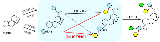 图2水稻来源的糖基转移酶OsUGT91C1在甜菊糖苷糖基化中的典型催化反应示意图