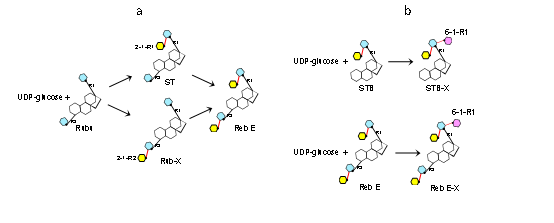 甜菊糖苷(steviol glycosides)是从草本植物甜叶菊分离的一系列高甜度、低热量天然甜味组分,目前已在食品和饮料行业得到较广泛的应用。其中甜叶苷(Stevioside)和甜菊糖苷A(Rebaudioside A)是甜菊糖苷天然含量最高的组分,二者虽然甜度高(约为蔗糖甜度的200倍)但口感不好,有明显的后苦味,影响了其应用领域及市场接受度。最近在甜叶菊中发现了两种口感最接近蔗糖的甜菊糖苷D和M(Rebaudioside D、M),它们几乎没有后苦味,是有望取代传统高热量糖的新一代健康甜味剂。不过这两种口感最佳的甜菊糖苷成分是甜叶菊中的稀有组分,天然含量低于0.5%,不可能直接从甜叶菊叶片进行商品化的提炼和纯化,限制了理想甜味成分甜菊糖苷D和M的规模化生产和供给。