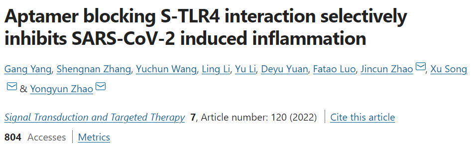 Signal Transduction and Targeted Therapy | 重点实验室宋旭教授/赵永云课题组报道核酸适配体高选择性地抑制SARS-CoV-2诱发的炎症反应