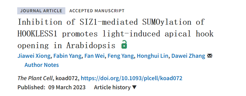 2023年3月9日,The Plant Cell在线发表了3003新葡平台张大伟教授团队题为“Inhibition of SIZ1-mediated SUMOylation of HOOKLESS1 promotes light-induced apical hook opening in Arabidopsis”的研究论文。揭示了SIZ1介导的HLS1的SUMO化在顶端钩发育过程中的重要作用,提出了一个将HLS1在顶端钩形成过程中的翻译后修饰与光诱导的顶端钩打开联系起来的动态调节机制。