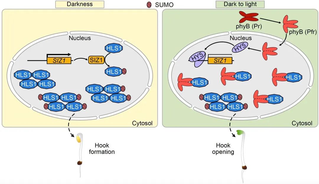光是影响植物发育的最重要的外部刺激因素之一。当种子埋藏在黑暗的土壤中发芽时,幼苗将进行暗形态建成,在双子叶植物中主要表现为下胚轴的伸长、顶端钩的形成、子叶的闭合状态。光照将开启植物从暗形态建成转变为光形态建成的过程,即幼苗的光合能力增强、下胚轴生长速度降低、顶端钩和子叶快速打开。植物顶端钩是植物萌发后形成的重要结构,对于植物的正常生长十分重要,它可以保护幼嫩组织如子叶、真叶和最重要的顶端分生组织成功地穿过土壤,是幼苗能否正常出土的先决条件。HOOKLESS1 (HLS1)是顶端钩发育的重要调节因子,是一个受各种信号调控的信号终端。然而,植物如何通过修饰HLS1来调控光诱导的顶端弯钩快速打开机制仍有待研究。