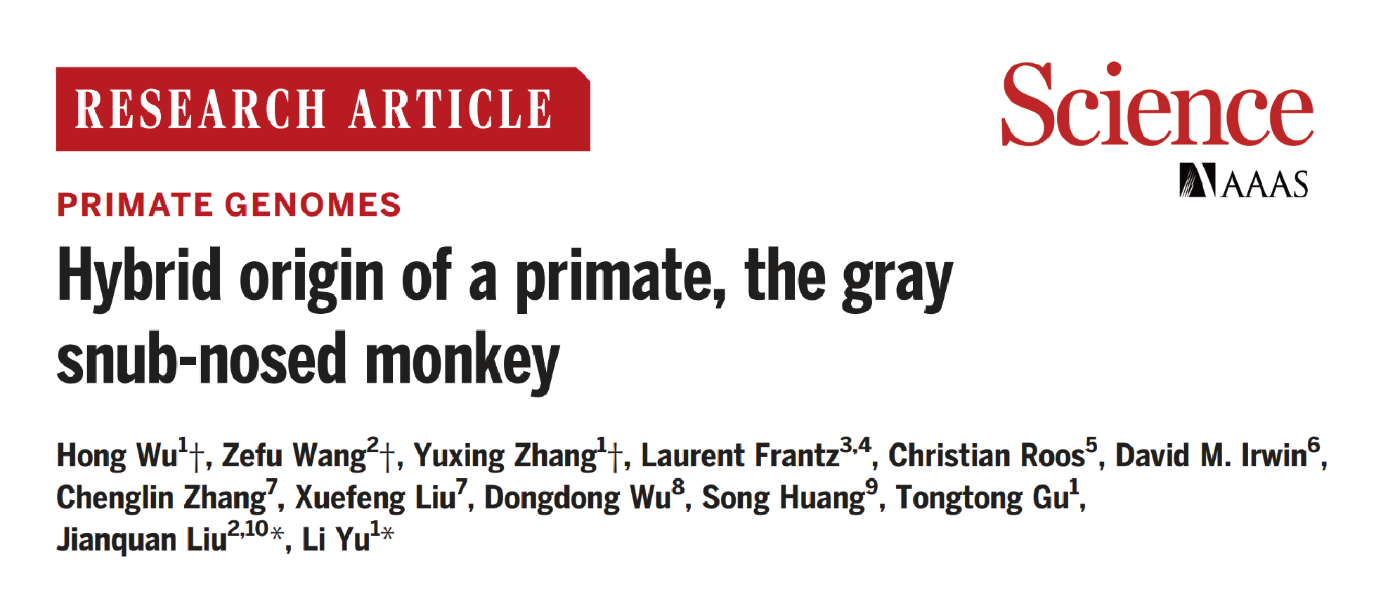 北京时间2023年6月2日凌晨,3003新葡平台刘建全教授团队与云南大学于黎研究员团队在国际权威期刊Science联合发表了题为Hybrid origin of a primate, the gray snub-nosed monkey的研究论文(图1),通过比较基因组学、群体基因组学、分子功能实验等方法,揭示了黔金丝猴的同倍性杂交起源。