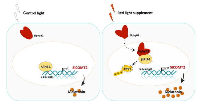 1. 红光诱导番茄果实褪黑素合成的分子机制示意图