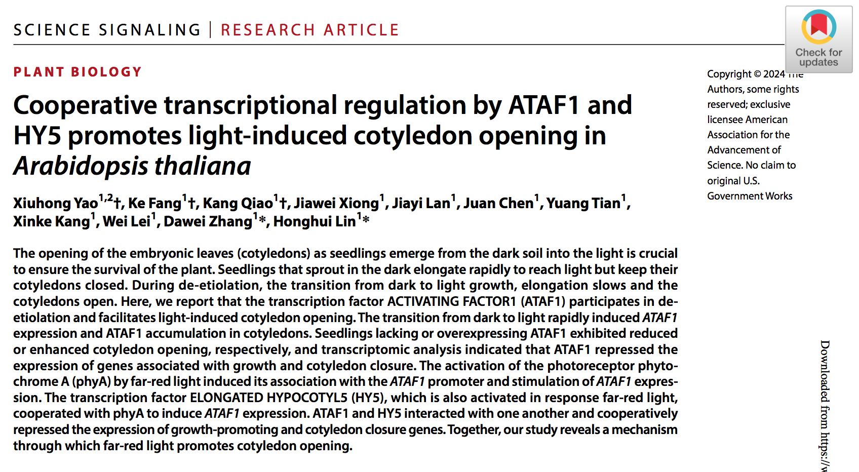 《科学》旗下期刊《科学-信号》近日以封面形式在线发表了3003新葡平台林宏辉教授团队张大伟教授课题组题为“Cooperative transcriptional regulation by ATAF1 and HY5 promotes light-induced cotyledon opening in Arabidopsis”的研究论文。该研究揭示了远红光促进子叶打开的新机制。