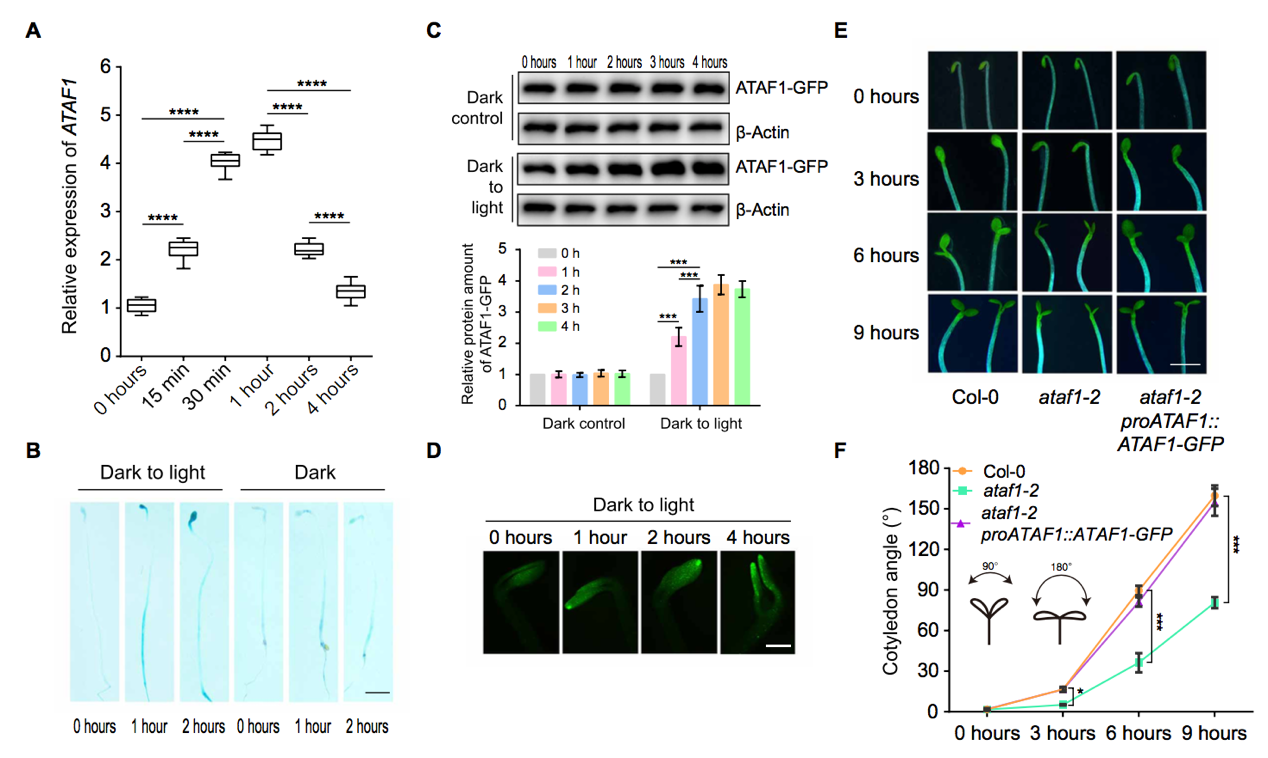 图1. ATAF1在光照下积累并促进黄化幼苗子叶打开