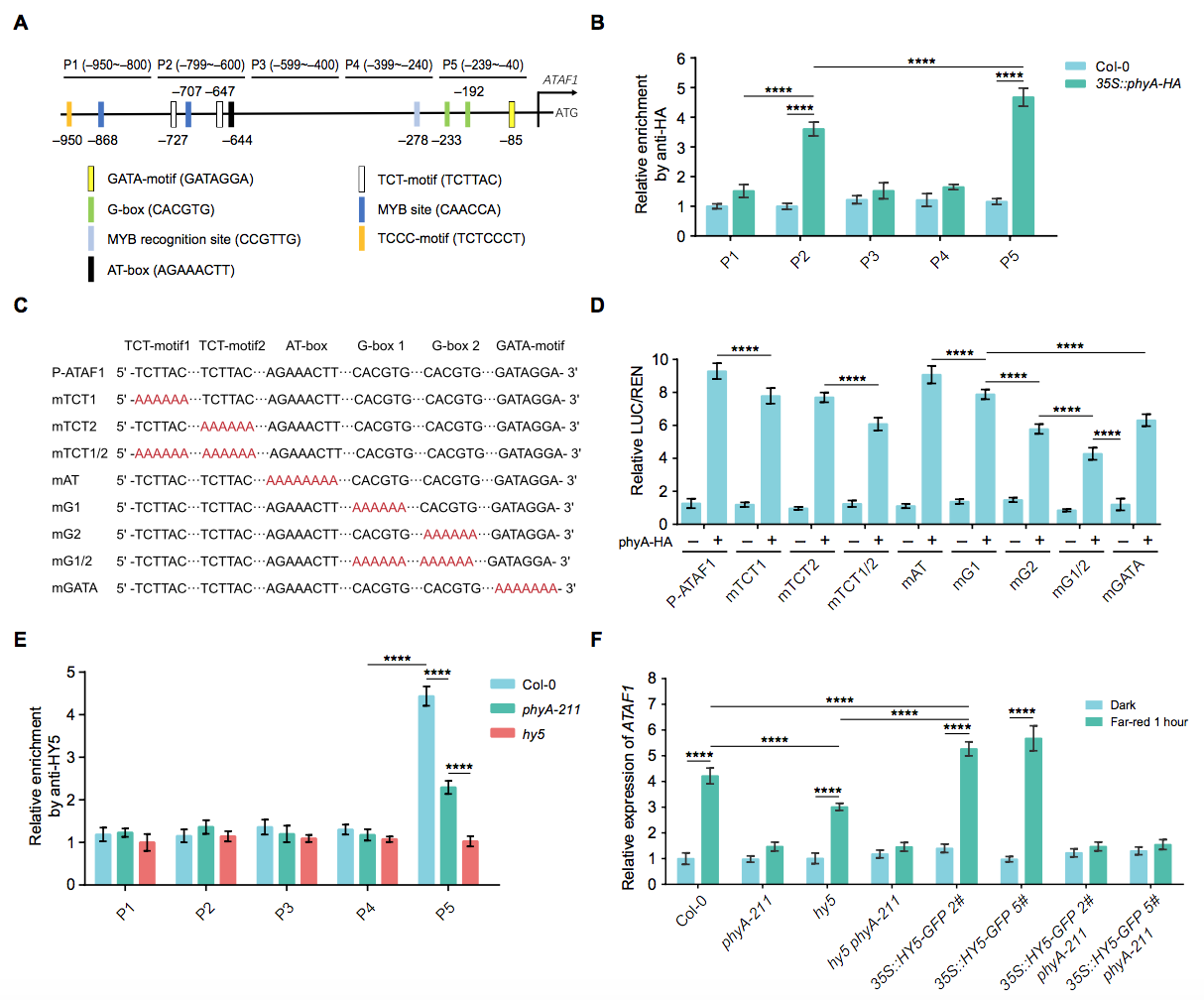 进一步的遗传学和分子生物学研究表明ATAF1在光下的积累依赖于远红光受体phyA的转录激活,phyA与转录因子形成的复合体(如HY5)直接结合ATAF1的启动子进行转录激活(图2),促进ATAF1蛋白的积累。