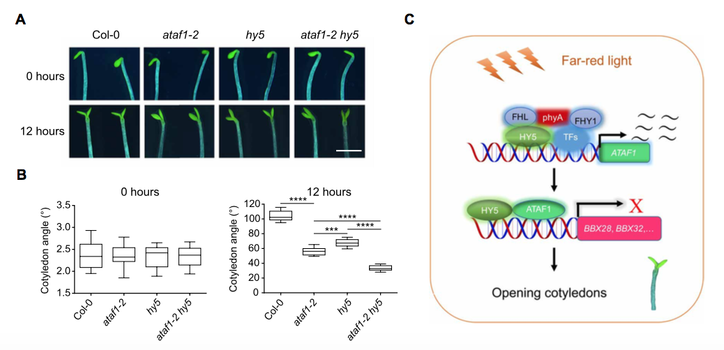 图3. 远红光激活的ATAF1和HY5协同促进黄化幼苗子叶打开