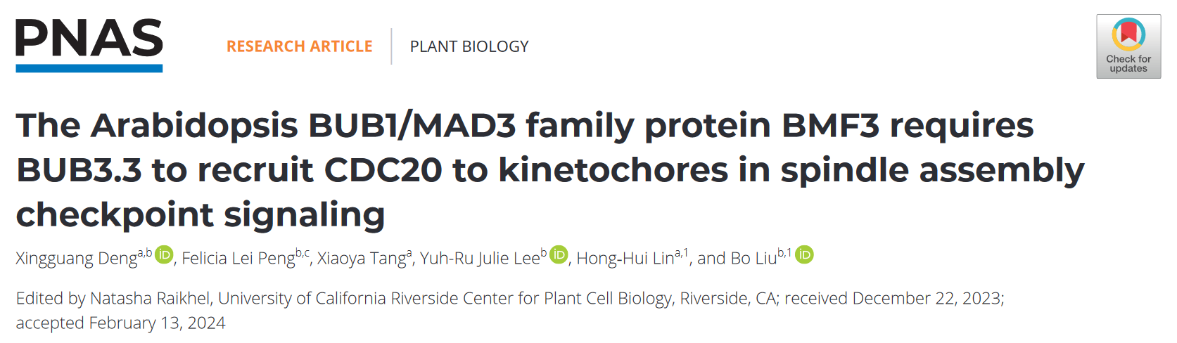 PNAS|重点实验室林宏辉课题组与加州大学柳波课题组合作解析BUB3.3调控植物纺锤体组装检验点的新机制